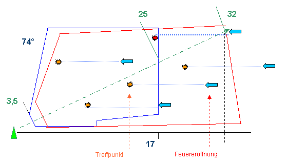 Bei der Kalkulation der Entfernung für die Feuereröffnung kommen neben den physikalischen Bedingungen: Höhe Geschwindigkeit und Parameter zusätzliche Schiessbedingungen in Betrachtung :